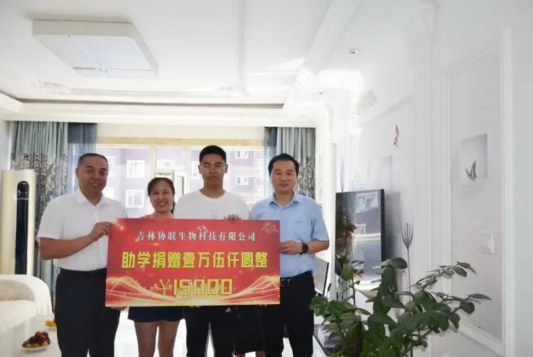 8月15日上午,在鎮賚教育局徐放局長、鎮賚第一中學校長呂鑫淼等領導老師的陪同下,江蘇國信協聯能源有限公司總經理、吉林協聯生物科技有限公司執行董事王立軍、綜合辦主任陳玉英來到鎮賚縣第一中學參加2024年高考并被錄取北大的學生劉亞軒家中,代表公司向鎮賚優秀學子劉亞軒全家表示祝賀并送上一萬五千元助學金。